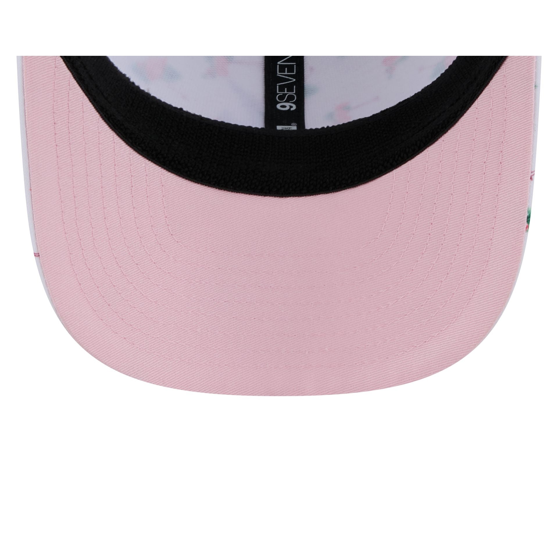 The Atlanta Braves Pattern 9SEVENTY Trucker Hat features an allover flamingo print with an embroidered Braves logo at the front panels with an adjustable snapback closure at a mesh rear.
