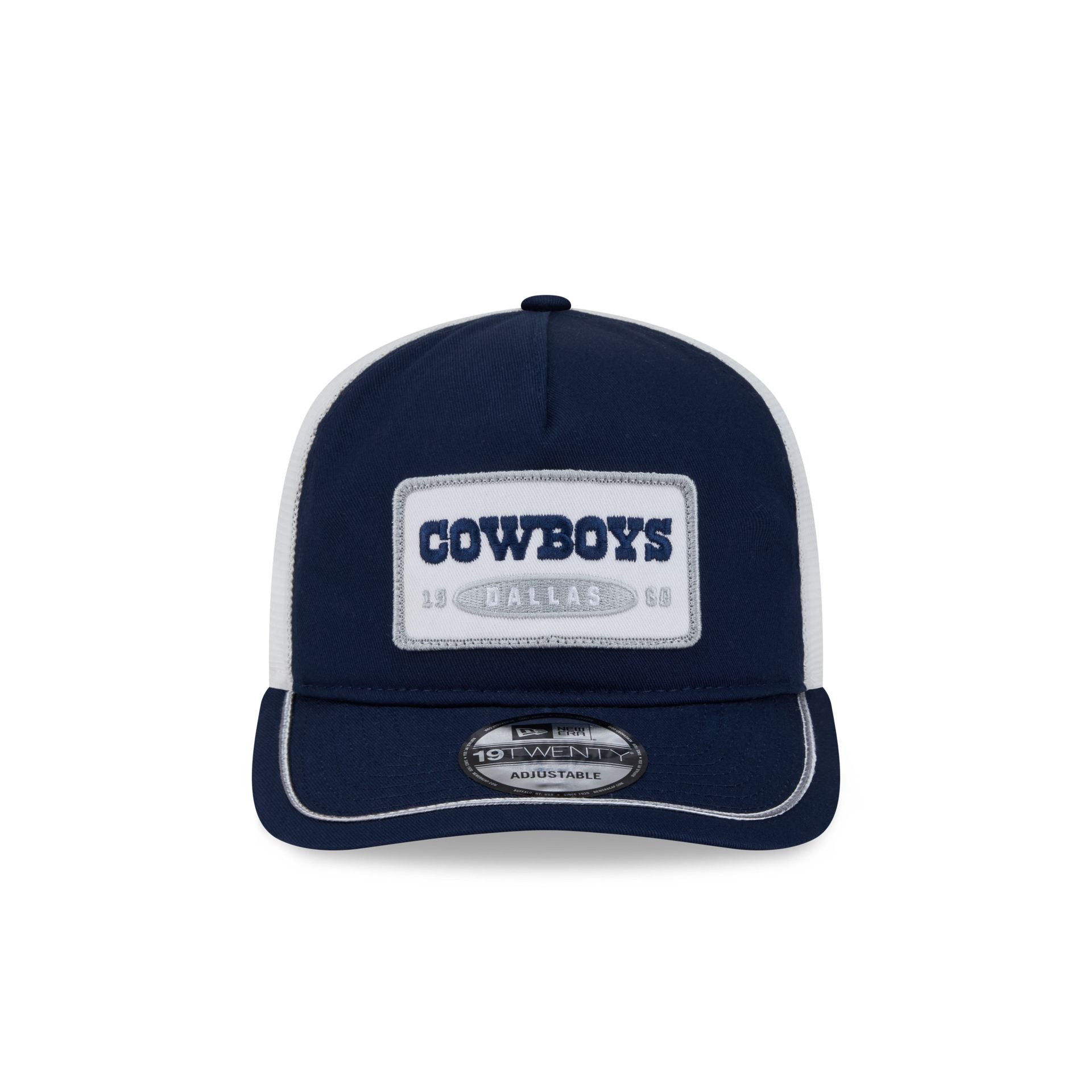 The Dallas Cowboys Patch 19TWENTY Trucker features an embroidered Cowboys patch at the front panels with an adjustable snapback closure at a mesh rear.