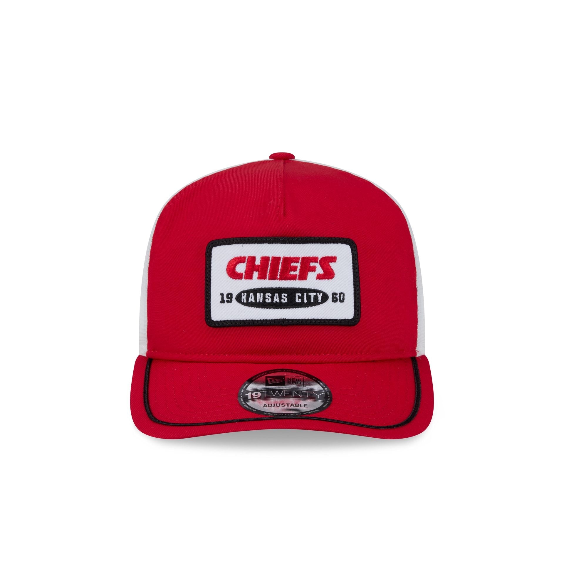 The Kansas City Chiefs Patch 19TWENTY Trucker features an embroidered Chiefs patch at the front panels with an adjustable snapback closure at a mesh rear.