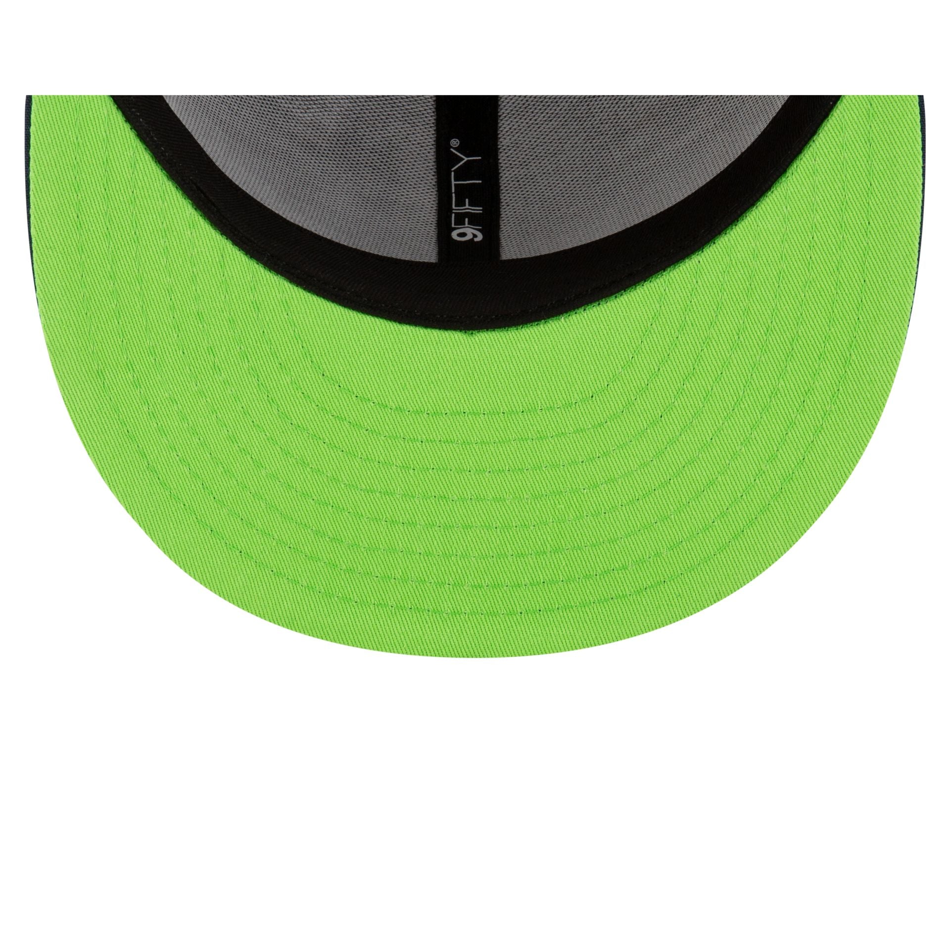 The Seattle Seahawks Helmet Pack 9FIFTY Snapback features an embroidered fabric applique Seahawks replica helmet design at the crown with a matching woven team logo tag at an adjustable snapback closure at the rear and a green undervisor.
