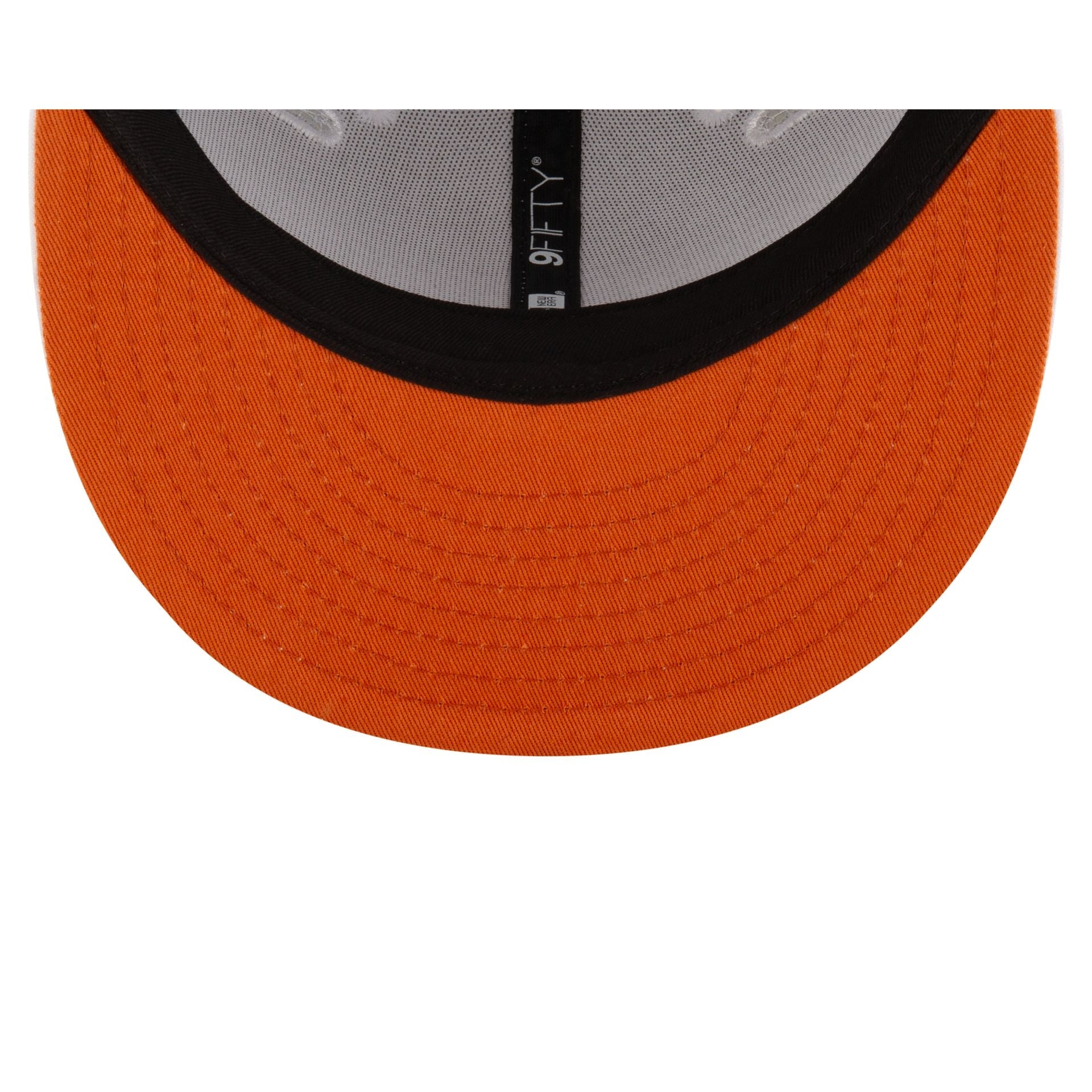 The Texas Longhorns Helmet 9FIFTY Snapback features an embroidered Longhorns logo at the left and right-wear side and a helmet stripe down the middle of the crown. Additional details include a team tag on a snapback closure at the rear.